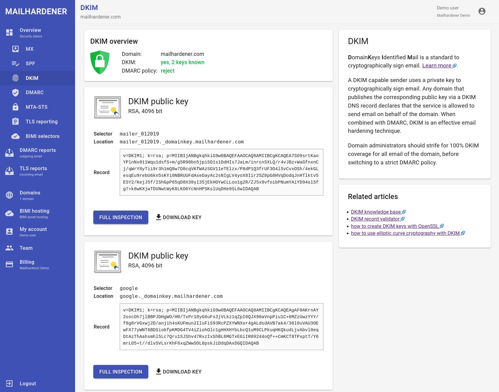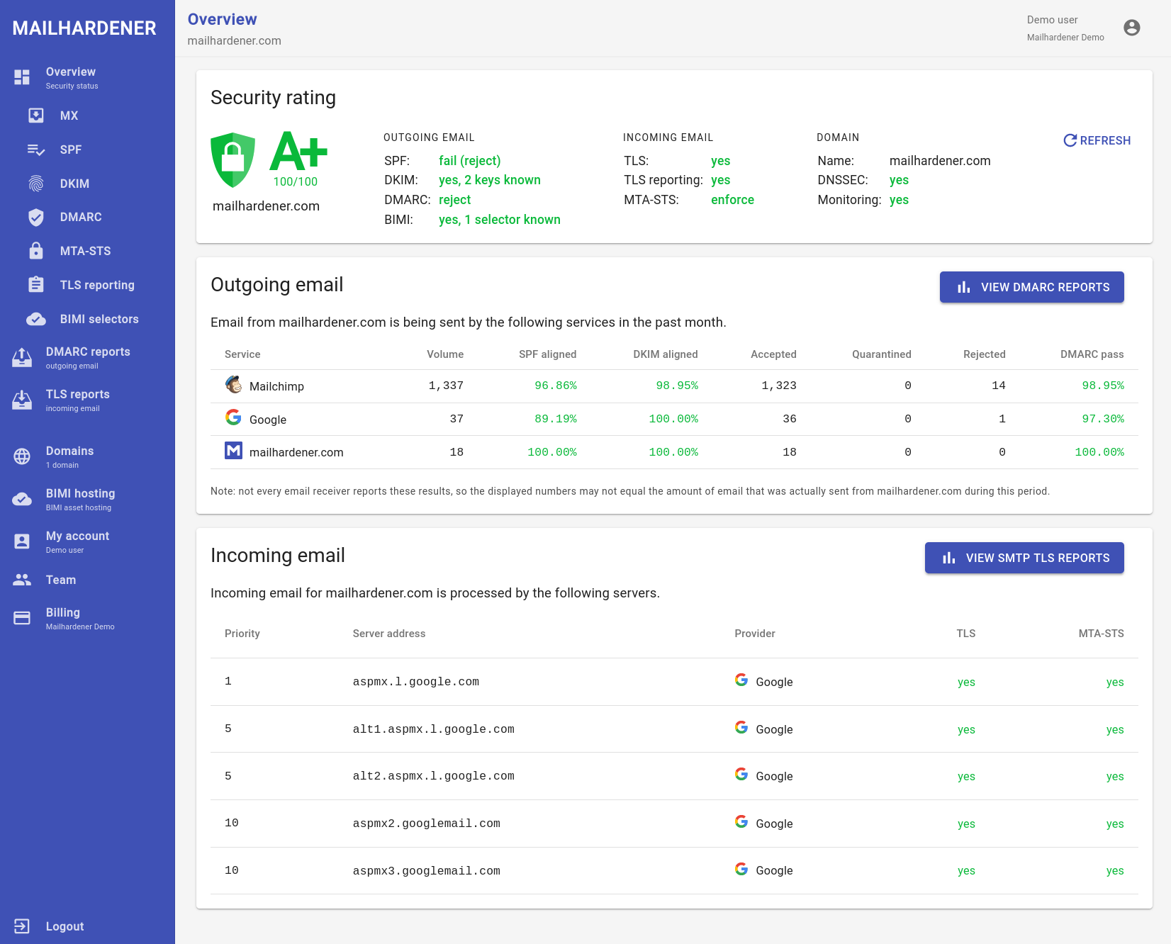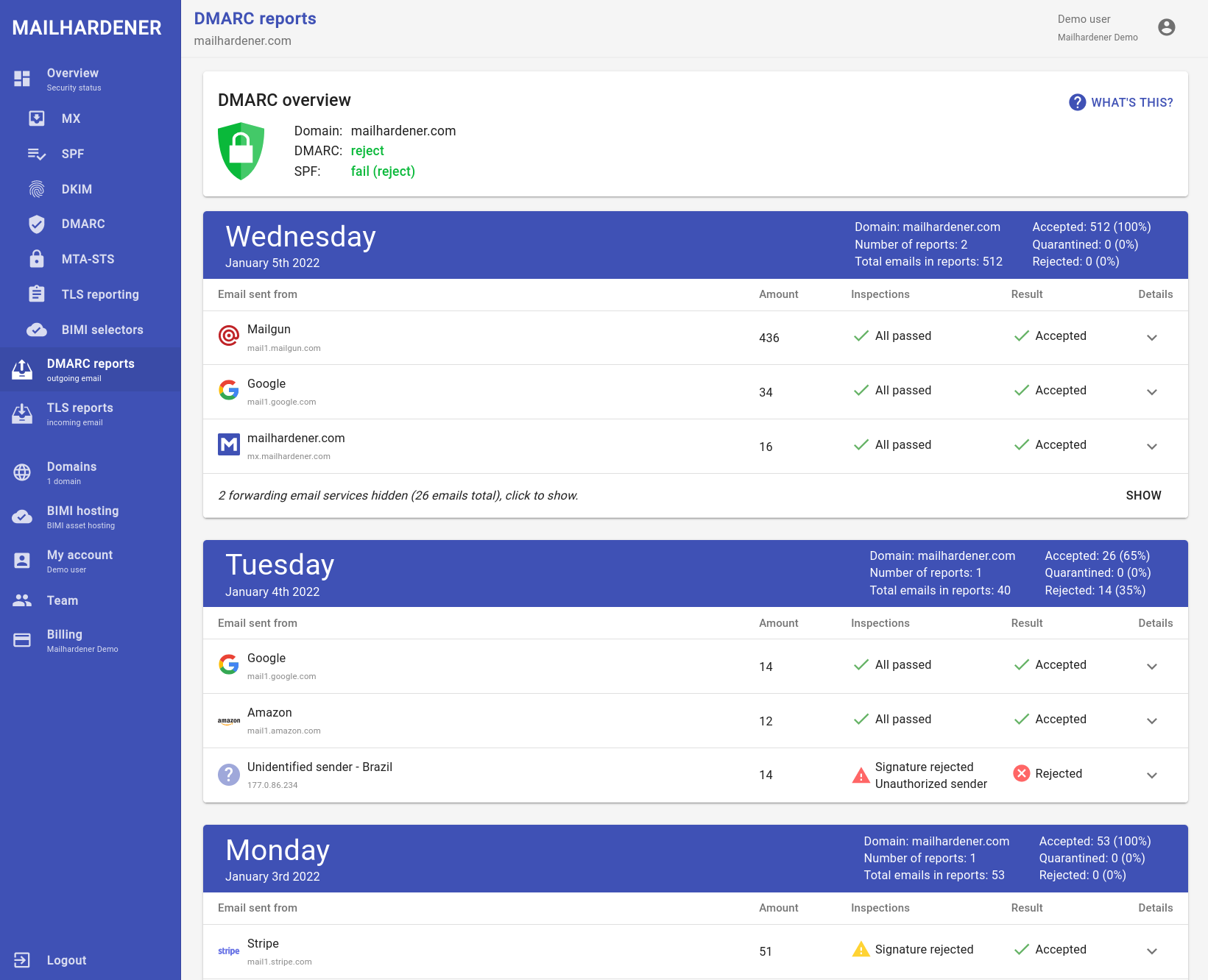MailHardener offers robust DMARC reporting and enforcement, simplifying email authentication for businesses.